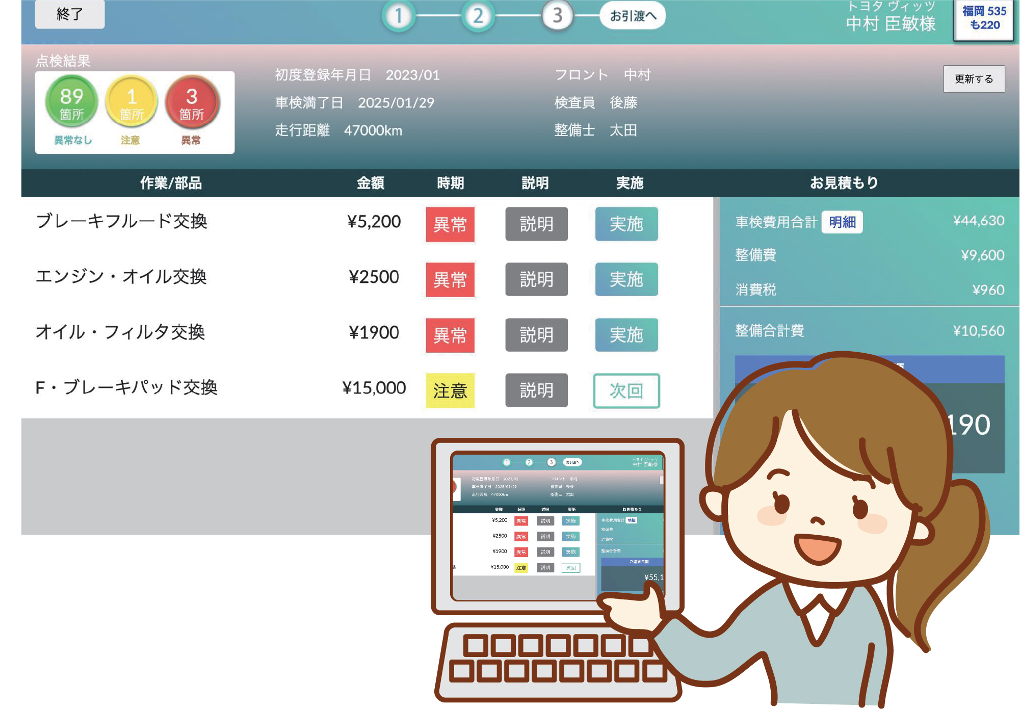 「目で見る車検」を行い、お客様に見積りに参加していただきます。